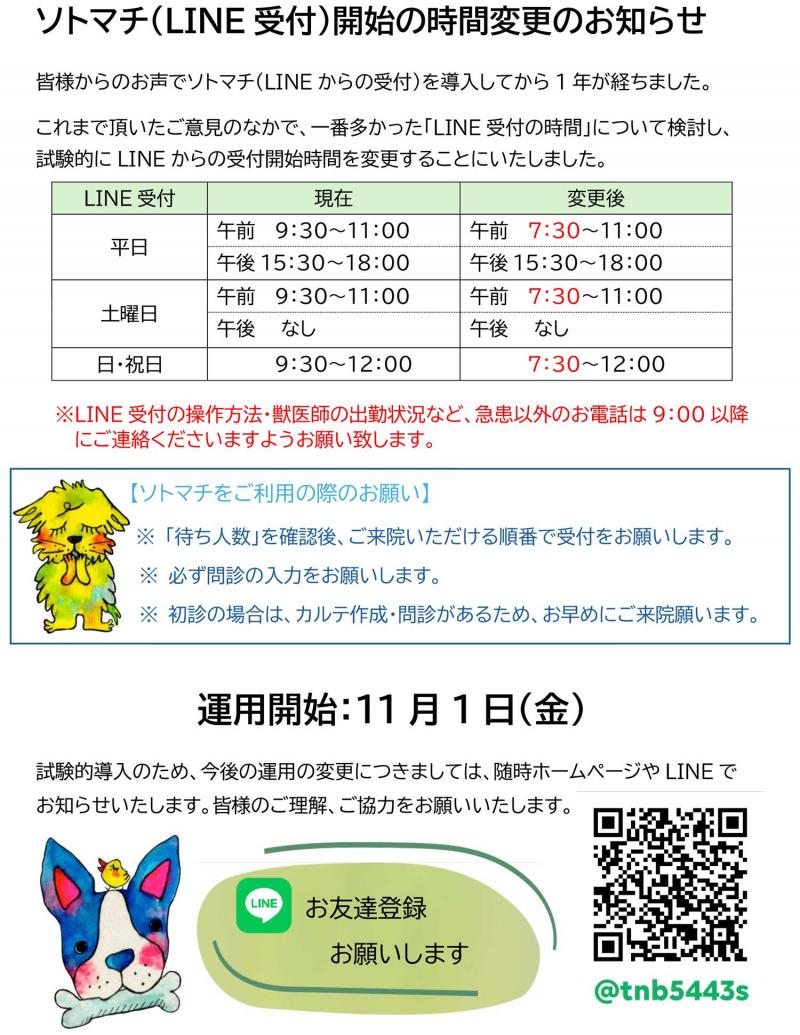 トップ > 病院からのお知らせ > 11月1日からLINE受付の開始時間が変更になります
